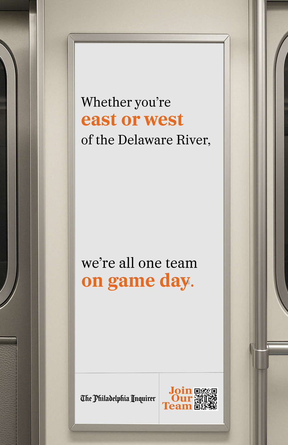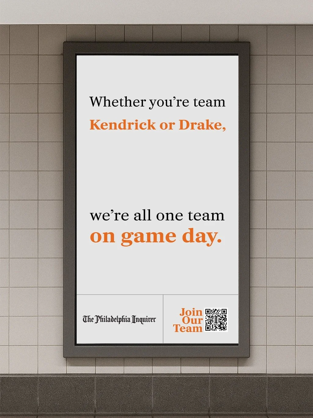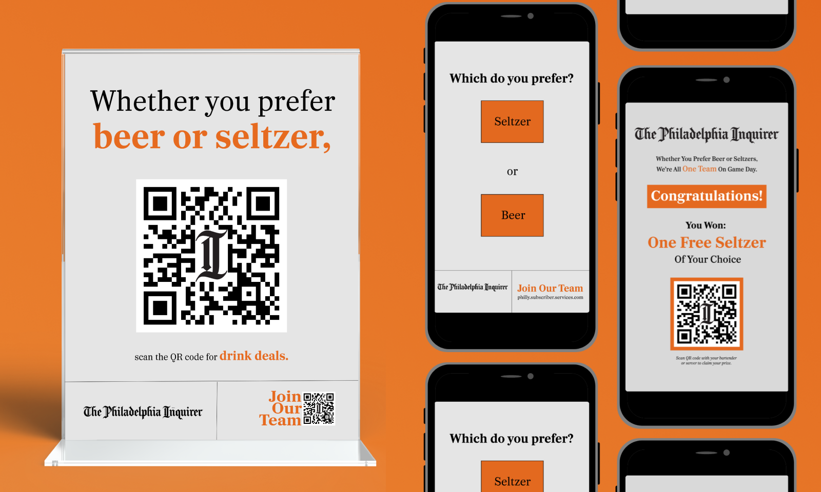 We extended the campaign with an interactive activation at Xfinity Live, one of Philly’s most iconic sports bars located just outside the stadiums at NRG Station—the final stop on the SEPTA line and the gateway to game day. Symbolically, it’s the last stop before the action begins, making it the perfect place to connect with fans in a shared moment of pride and anticipation. Branded QR codes throughout the space allowed users to choose between a beer or seltzer and unlock a custom reward. Existing Philadelphia Inquirer subscribers received instant access, while new users were prompted to sign up. The activation blended physical and digital experiences, positioning The Inquirer not just as a source of coverage, but as an active part of Philly’s fan culture.